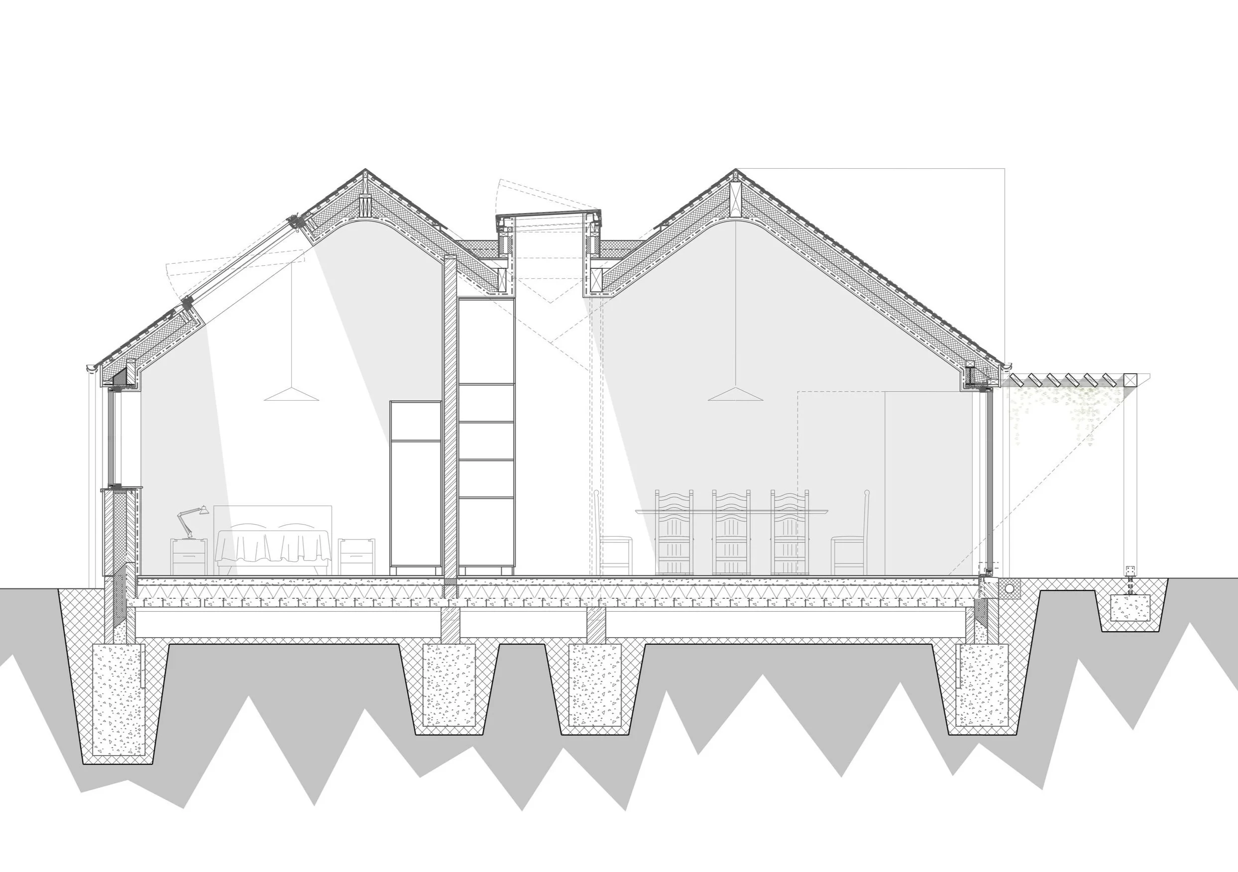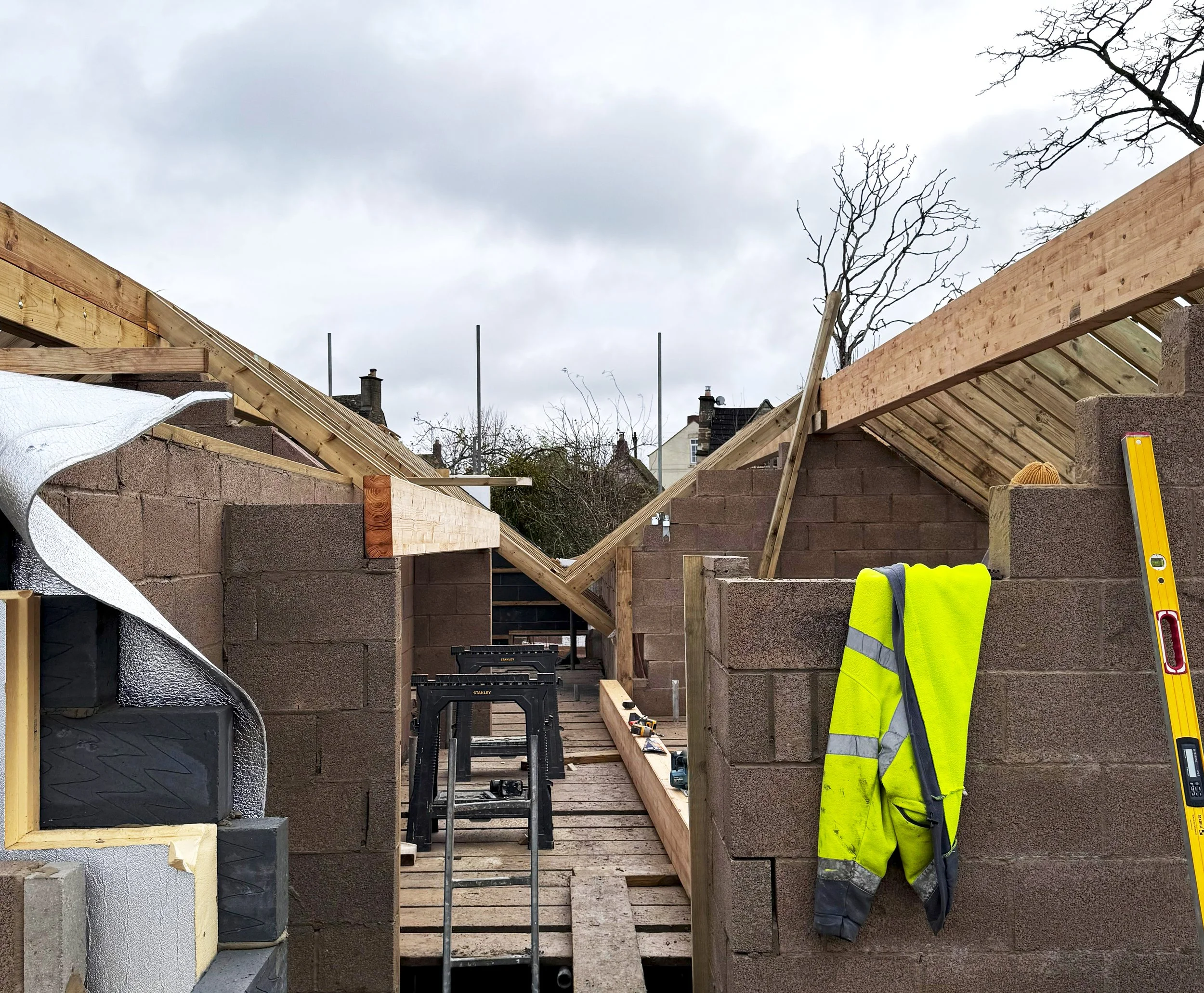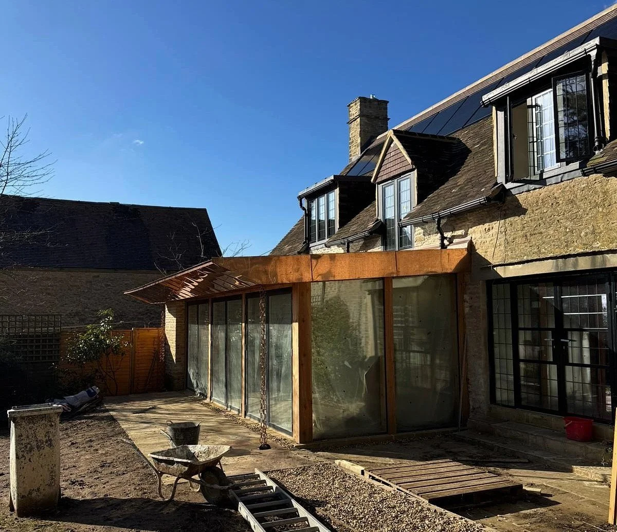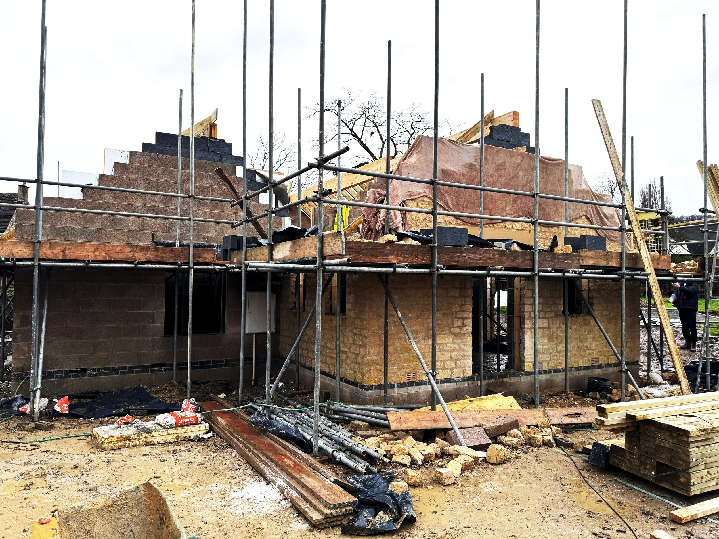 Works have commenced on site for a new single storey house in Leonard Stanley, Stroud. A number of neighbouring Grade-II listed historic properties surround the site, and the design is sensitively formed, adopting traditional Cotswold materials, including natural stone, render and natural dark slates. These traditional materials are combined with modern construction techniques to create a highly sustainable new home. Integrated solar panels, an air source heat pump, high performance window and doors, combined with exemplary levels of insulation throughout - create an energy efficient and sustainable new home. A planted pergola protects the glazed elevation from solar gain during warmer weather, while maximising natural daylight and access to the garden. The design provides a lifetime home for our client, with a single storey design which considers later living and accessibility.