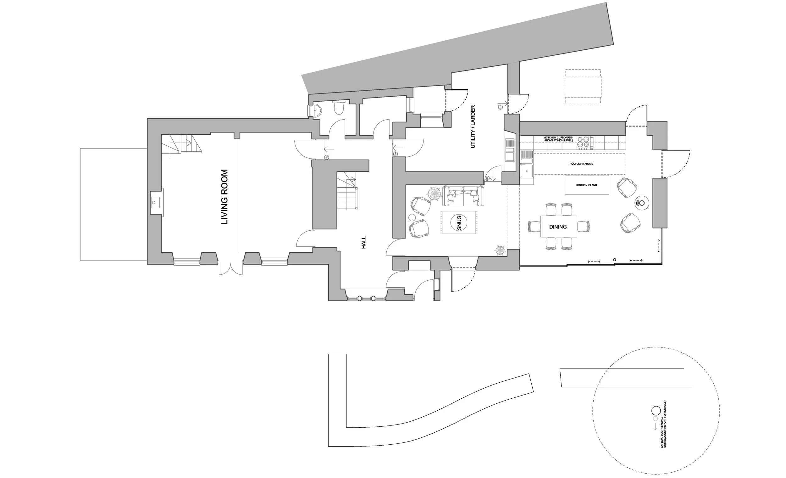Natural Cotswold stone is partnered with a mono-pitched green roof and high performance windows and doors to provide an exciting kitchen dining space with stunning views across the Golden Valley. A glass to glass corner opens to the garden, providing a fresh, light filled living space which celebrates its settings. The contemporary design complements the traditional features, materiality and proportions of the original house.