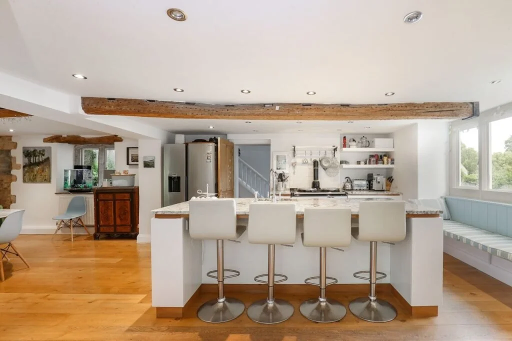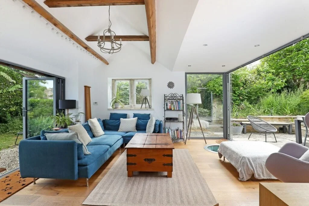 The property is described as a desirable property in the Chalford area: ‘Tucked away in the heart of Chalford Hill, The Ferns is a striking five-bedroom detached Cotswold stone residence that beautifully blends historic charm with modern living.’